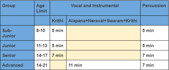 - Advanced Vocal and Instrumental will be viewed as one category. Advanced Mridangam, Kanjira, Ghatam and other percussion instruments will be combined under Advanced Percussion.